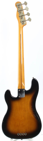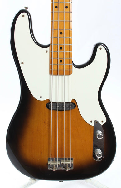 1988 Fender Precision Bass '54 Reissue, sunburst. Made in Japan, serial number JV81858. This bass is 100% original and features a 4-21-88 neck date and '88 pot codes. It's not the first OPB54-75 model we've seen with a factory JV serial number on the bridge plate and it's likely that Fender Japan used up some parts from the initial JV run for these. The bass shows some wear overall, a really nice '54 to '56 style reissue. Weighs 4.15kg.