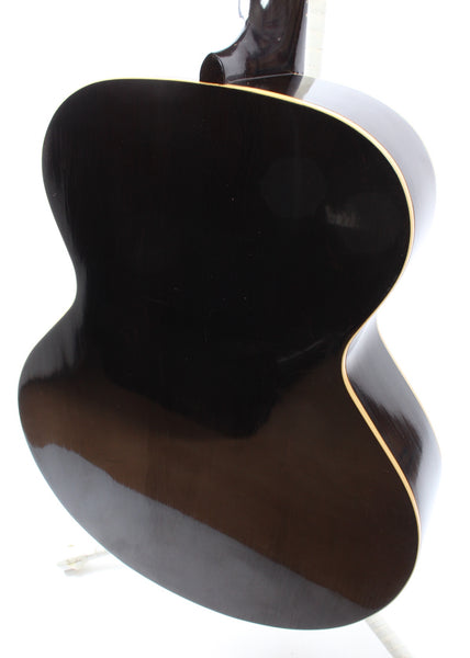 1936 Gibson L-50, sunburst. made in USA, FON 661B22. This guitar is all original and features an added pickup (the jack is only tucked underneath the pickguard with some rubber bands holding it in place). It's an excellent solid top (!) archtop with a lovely V neck profile and most likely the cleanest L-50 you'll find for sale anywhere. Sounds heavenly. Comes with its original hardshell case. Weighs only 2.2kg.