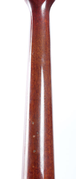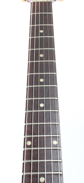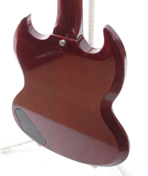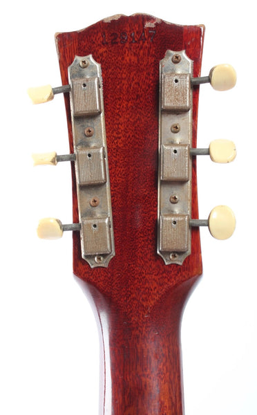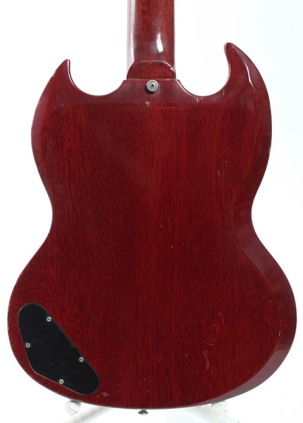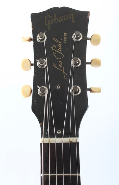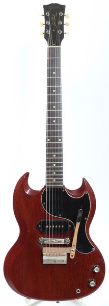 1963 Gibson Les Paul Junior, cherry red. Made in USA, serial number 129147. This guitar is all original, except for the tremolo arm and the bridge with proper g-string intonation. The two outer control cavity screws were oxidized and broke off, the screw heads are now merely glued on (the plate stays in place nice and firm). As a result of the oxidation, some solder joints were also redone. The guitar shows wear and tear, but displays a vibrant cherry red color. Freshly serviced with 10-46 strings, excellent frets and lovely neck profile. Although commonly known as the SG Junior, this one still displays the Les Paul Junior silk screen on the headstock. Comes with a vintage hardshell case. Weighs 3.1kg.