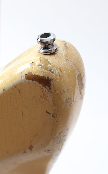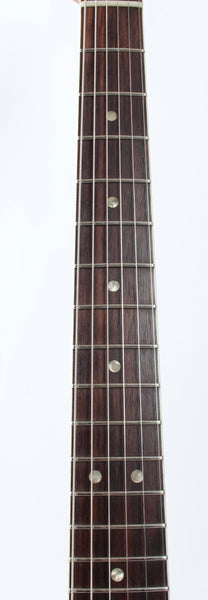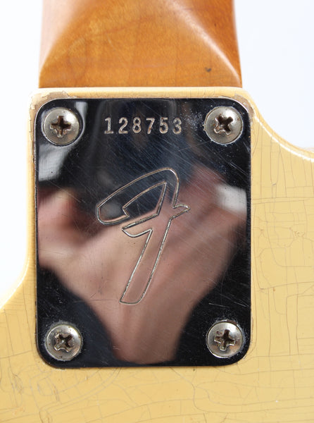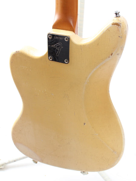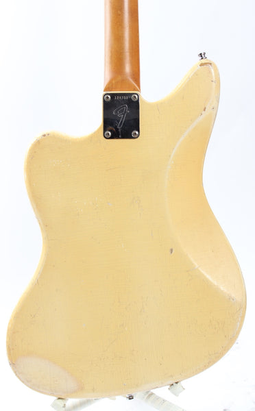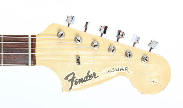 1966 Fender Jaguar, olympic white. Made in USA, serial number 128753. This guitar is all original, except for a pro refret with a new nut, tremolo arm and the strap buttons. Plus the mute is missing and the lead circuit volume and tone pots were replaced with DiMarzio 500k pots in 1990 and the mid-cut features a different cap. This combination makes for an excellent sounding instrument. February '66 neck date, 10-15-66 and 11-9-66 pickup dates. Shows a lot of wear, plays incredibly well. Has two small touchups on the body. Comes with a recent black tolex G&G hardshell case. Weighs a hair below 3.8kg.