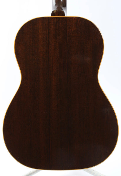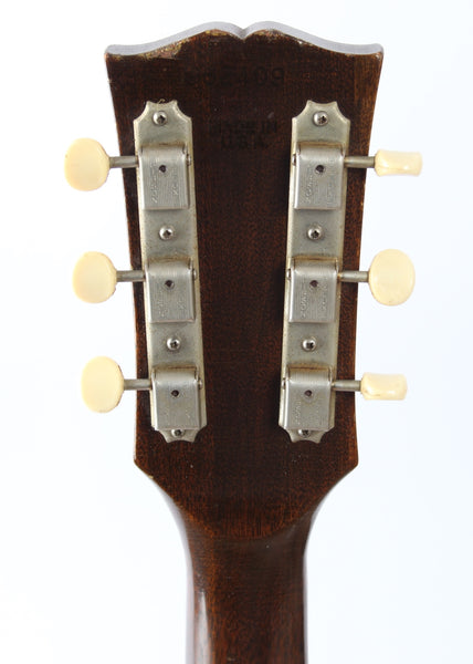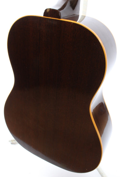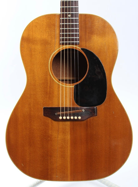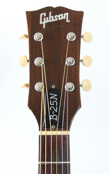 Ca. 1970 Gibson B-25N, natural. Made in USA, serial number 962409. This guitar is all original. It shows a lot of wear and has repaired cracks. The frets are in excellent condition. Rare B-25 with a pearloid logo on the headstock. Comes with a hardshell case. Weighs 2kg.