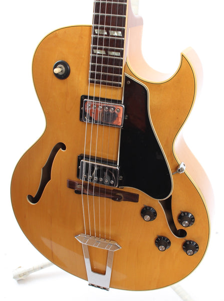 Ca. 1974 Gibson ES-175D, natural. Made in USA, serial number 397376. This guitar is 100% original, except for the replaced switch rubber ring (original in case). The wooden bridge base was cracked and repaired. The truss rod cover was personalized by a previous owner and in the process of reinstalling it, they mistakenly added an extra screw hole (only visible when the truss rod cover is removed). The original Patent No. stickered humbuckers sound phenomenal in this guitar. It's labelled as an ES-175D, but it is obviously a model ES-175DN. The natural blonde finish on any ES-175 is pretty rare and certainly beautiful! Comes with a neat hardshell case. Weighs only 3.1kg.