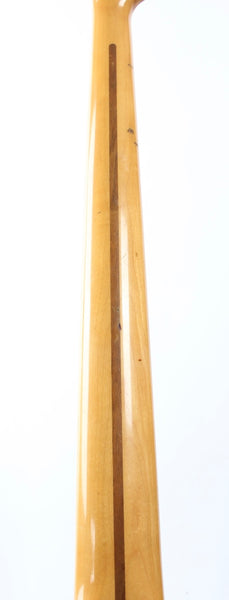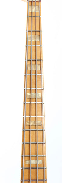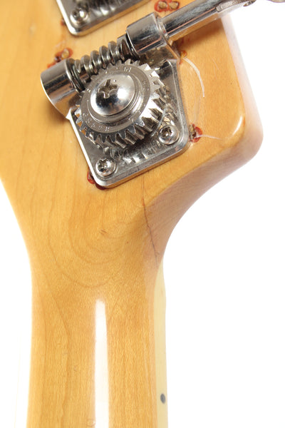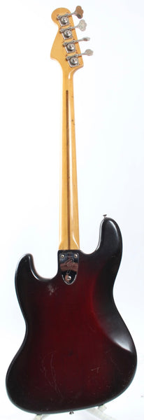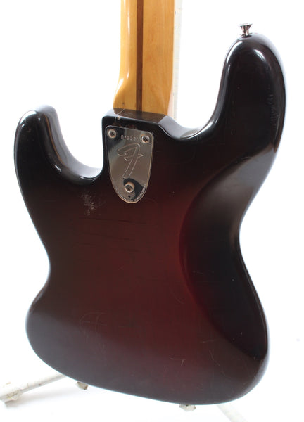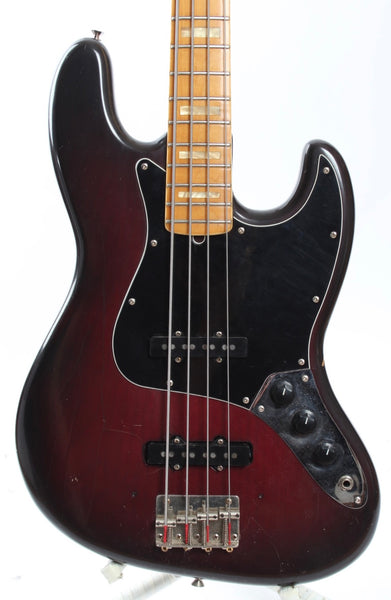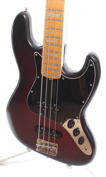 1975 Fender Jazz Bass, violet burst. Made in USA, serial number 679391. This bass was oversprayed in a violet burst color and at the same time, the neck was painted in the same color (and then removed, as evidenced by the faint headstock logo). The electronics, bridge, knobs, pickguard and most screws were replaced and the tuners were upgraded to Gotoh Res-O-Lite (many other sets of tuners were mounted prior as evidenced by the many extra screw holes). There are a few repairs from stress cracks. The pickups are original (the neck pickup was rewound) and despite its cosmetic shortcomings, this bass is a great playing and sounding instrument. Weighs 4.2kg.