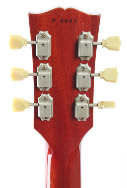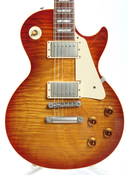 1998 Gibson Les Paul Standard '58 Historic Reissue, sunburst. Made in USA, serial 88843. This guitar is all original, except for the aluminum tailpiece and a late 1990s Burstbucker #2 in the bridge position. The pickup covers were off and are back on again. Stunning guitar overall, light wear, mainly on the back of the body. Excellent frets, freshly serviced with 10-46 strings. The Gibson Custom Shop didn't make R8's with such a pretty flametop back in the day, so don't miss out on this one. Has a barely noticeable and rock solid headstock repair, hence the lower price. Comes with its original black tolex Gibson hardshell case. Weighs a hair less than 4.3kg.