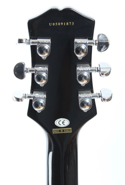 2005 Epiphone Flamekat, ebony with flames. Made in Korea, serial number U05091873. This guitar is all original and in very good condition. Weighs 3.85kg.