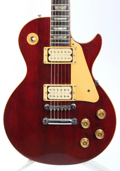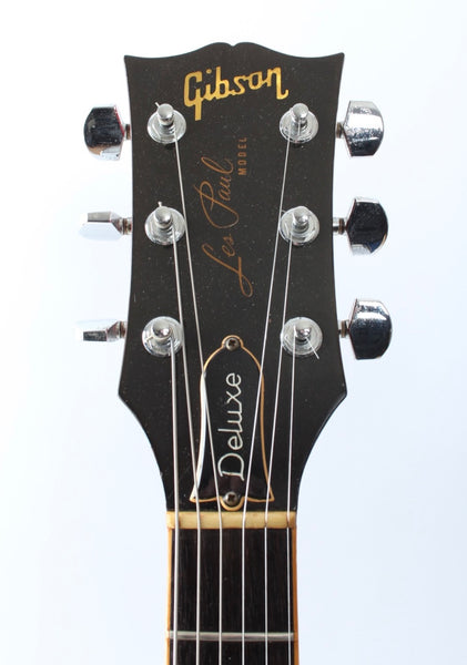 1976 Gibson Les Paul Deluxe, wine red. Made in USA, serial number 00134285. This guitar was converted to a Les Paul Standard with vintage Seymour Duncan double white '59 PAF pickups. It's mostly original, except for Schaller tuners and the knobs. Comes with the original hardshell case. Weighs 4.6kg.