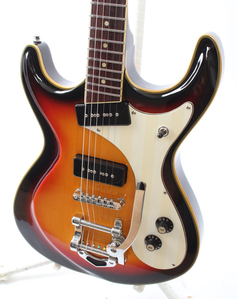 Ca. 2010s Eastwood Sidejack DLX, sunburst. Made in China. This guitar is all original, except for 500k CTS pots and a Sprague Orange Drop tone cap. Rare model with 5-ply top binding, matching sunburst headstock and Bigsby. Shows light wear only and some discoloration on the pickguard and headstock. Weighs 3.8kg.