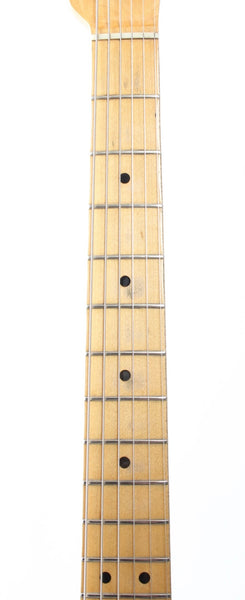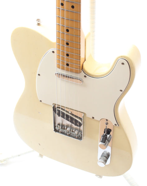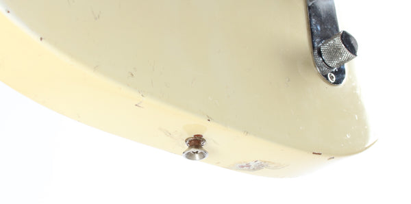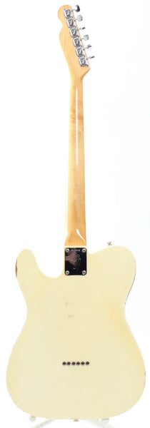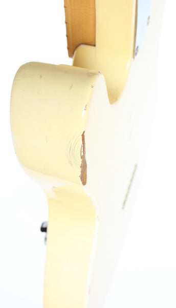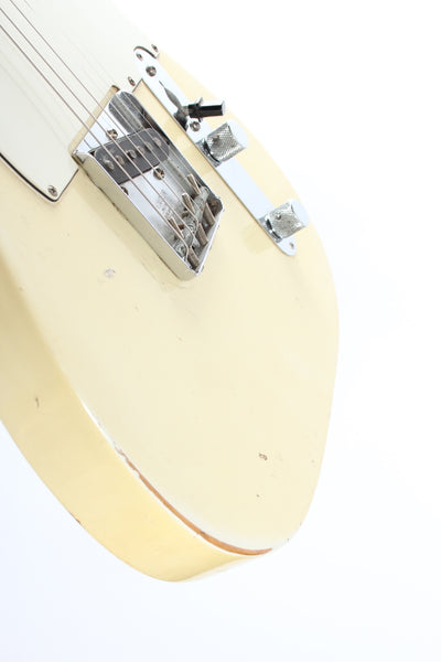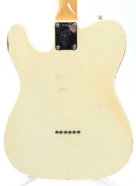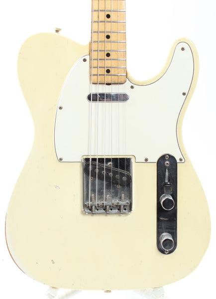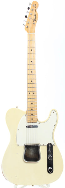 1967 Fender Telecaster, olympic white. Made in USA, serial number 213848. This guitar is 100% original, except for slightly later knobs. It's in very good condition, but it does show a good amount of wear on the body. The original, vintage sized frets on this one are low, but show not much play wear at all and the guitar plays nicely after a recent fret dress and setup with 10.5-50 strings. Nonetheless, you might want to consider a refret if you need tall or jumbo frets. This one has a November '67 neck date and we would normally call this an early '68, but the earlier style electronics with the red ceramic 'muffle' tone cap and most notably the bridge pickup with a '67 date work out just fine for a very late '67 production. The pots date to the 42nd week of 1965 and the guitar retains the original vintage wiring. It's a very nice, no issues maple neck Tele. Kinda 'affordable' custom color. Comes with a recent black tolex, tail logo Fender hardshell case. Weighs only 3.2kg.