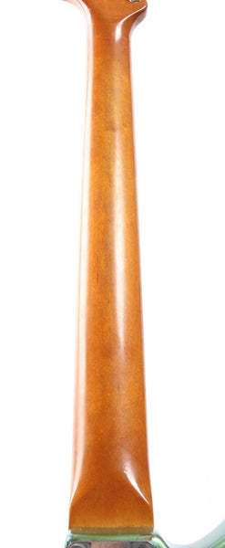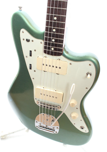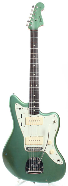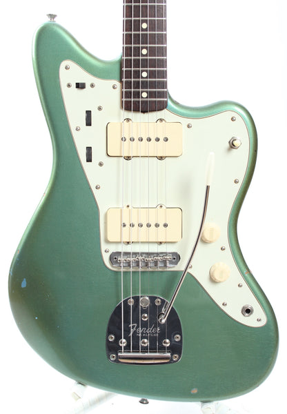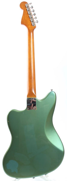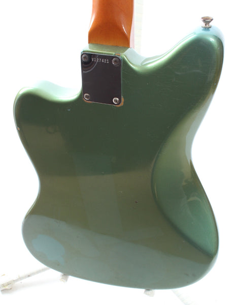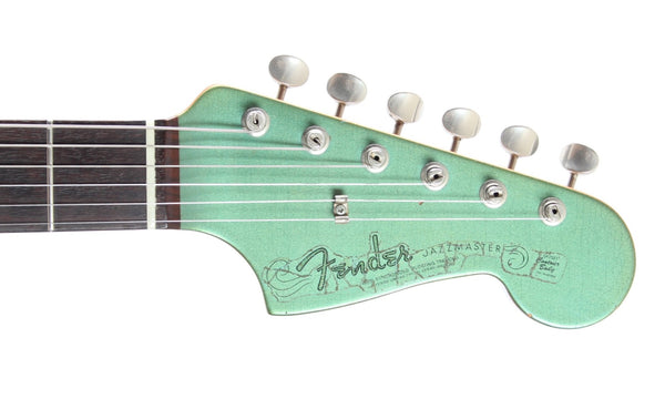 2000 Fender Jazzmaster American Vintage '62 Reissue, lake placid blue. Made in USA, serial number V127421. This guitar is 100% original. It shows a lot of wear and very cool weather checking and has yellowed to that perfect 60s shade of lake placid blue. There are some touchups around the bridge thimbles (only visible if you remove the pickguard). The matching headstock is somewhat rare on these. Excellent frets, freshly serviced with 11-49 strings. You might never find another AVRI like this one, what a cool guitar! Comes with its original brown tolex Fender hardshell case, manual and hang tag. Weighs 3.85kg.
