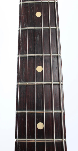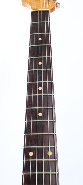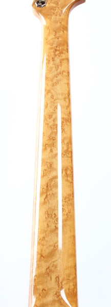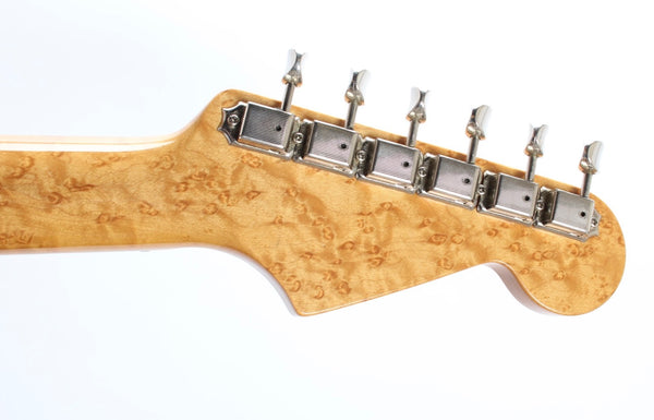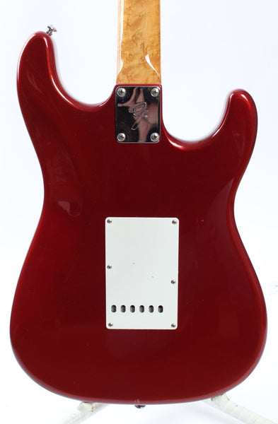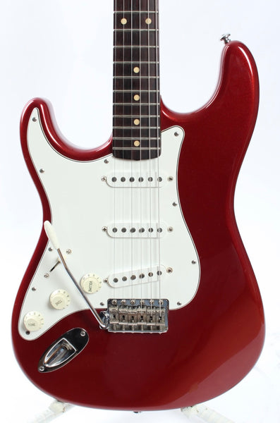 Ca. 2003 Warmoth Stratocaster '60 Reissue, red sparkle. Made in USA. Rare left handed Strat with high quality parts, such as: birdseye neck with a big D profile and a slab Brazilian rosewood fretboard with clay dots, Abbigail Ybarra 'AY' initialed Fender Custom Shop '69 Pickups (dated to '03, hence our best educated guess as to when the neck and body were made), Red sparkle lefty body, CTS pots, CRL 5-way switch. The body has some finish checking and a few dings, it's otherwise in excellent condition. Weighs only 3.4kg.