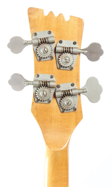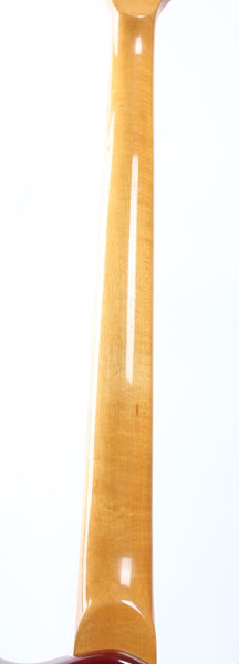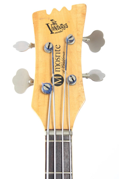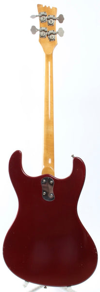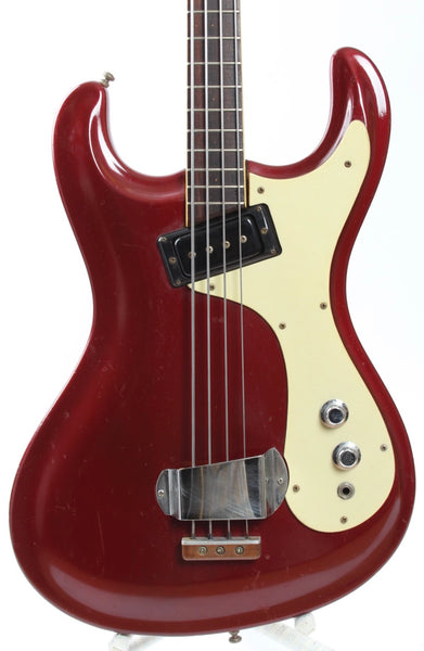 Ca. 1965 Mosrite The Ventures Bass, candy apple red. Made in USA, serial number 5627. This bass is mostly original, except for the electronics. The pickup was professionally rewound and sounds fantastic. Has a few touchups on the body. The truss rod was also replaced. Excellent frets, freshly setup. Great bass! Comes with its original hardshell case (replaced DYI handle). Weighs only 3.75kg.