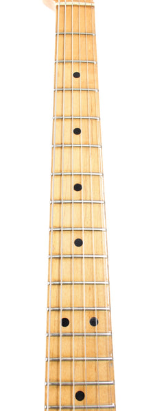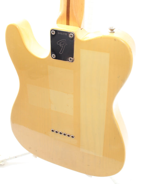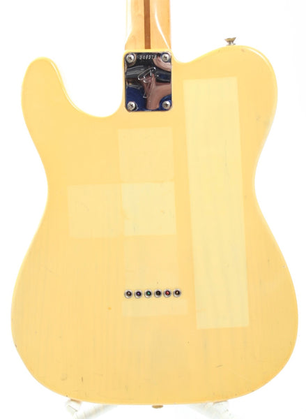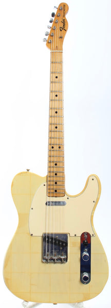 1972 Fender Telecaster, blonde. Made in USA, serial number 349376. This guitar is mostly original, except for a later 1980s volume pot and the knobs. The bridge pickup was professionally rewound. With a January '72 neck date, single string tree and the correct body shape, this Tele has all the desirable specs of a late 60s / early 70s Tele. The neck pocket is very tight and one piece of wood between the pocket and the neck pickup was reglued. The guitar plays and sounds wonderfully. Shows a lot of wear and some pretty cool sticker shadows. Comes with its original, albeit older, no-logo hardshell case. Weighs 3.8kg.