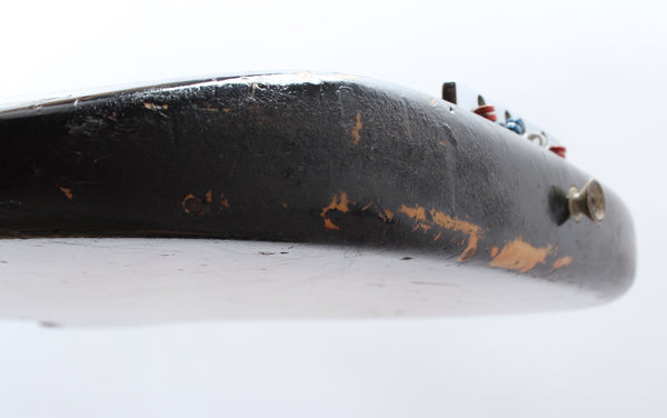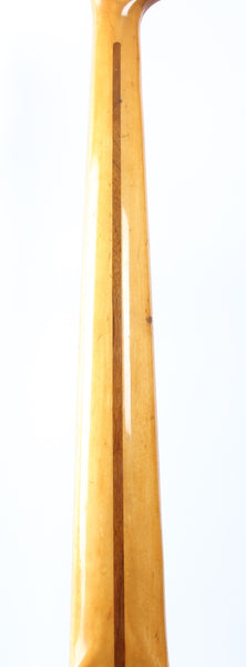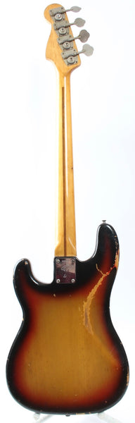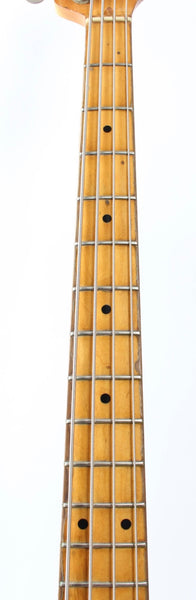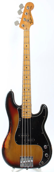 Early 1975 Fender Precision Bass, sunburst. Made in USA, serial number 646550. This bass is mostly original, except for the Badass II bridge, Seymour Duncan SPB-2 pickups and extra ground wire, the thumb rest and a screw on the G-string tuner. '75 neck code, the pots date to the 51st week of '74. Shows a lot of wear, feels great thanks to a chunky neck profile. Excellent frets.