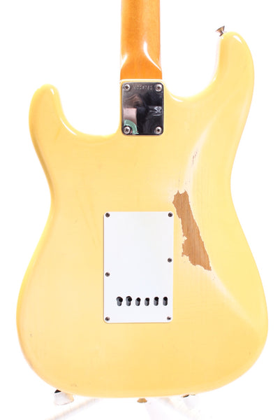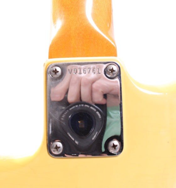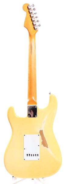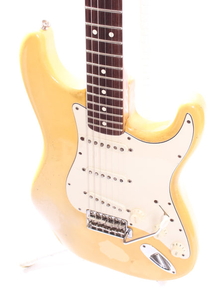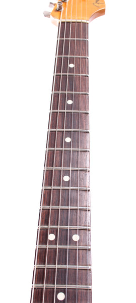 1983 Fender Stratocaster American Vintage '62 Reissue, vintage white. Made in USA, serial number V016761. This guitar is all original except for a recent professional refret, a '75 volume pot, the white plastic switch tip and professional shielding paint in the electronic and pickup cavities (the route underneath the bridge pickup was slightly deepened for that and the pickguard shield was also replaced with a better fit). It's a mojo machine and it comes with the original 'duck tab' tweed Fender hardshell case. Weighs 3.6kg.