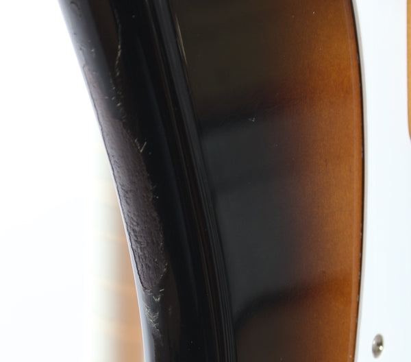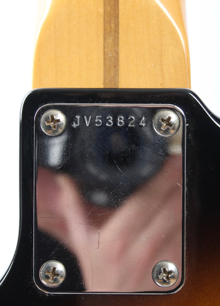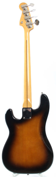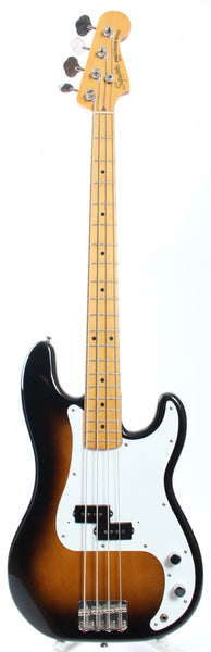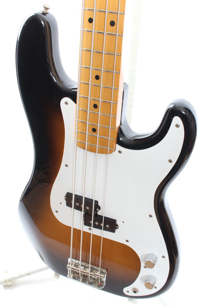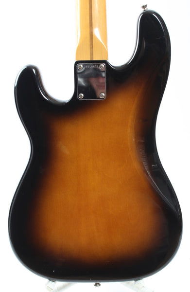 1983 Squier Precision Bass '57 Reissue, sunburst. Made in Japan, serial number JV53824. This bass is all original. It's in very good condition, except for one big touchup on the body. Excellent frets. 4-4-83 neck date, '83 pot codes. JV series basses have such comfortably round neck profiles and this one's no exception. Weighs a hair above 3.8kg only!