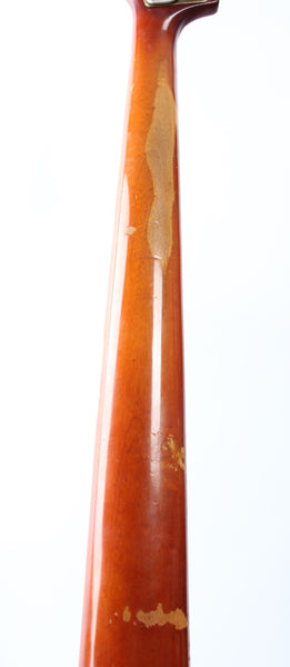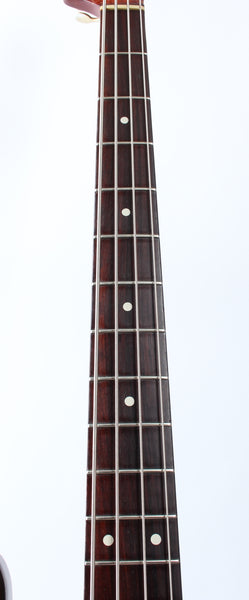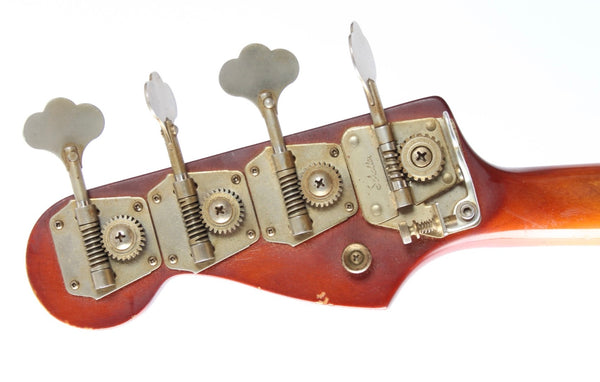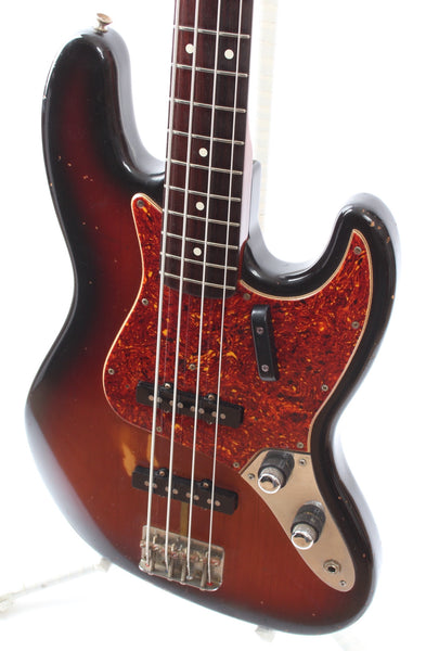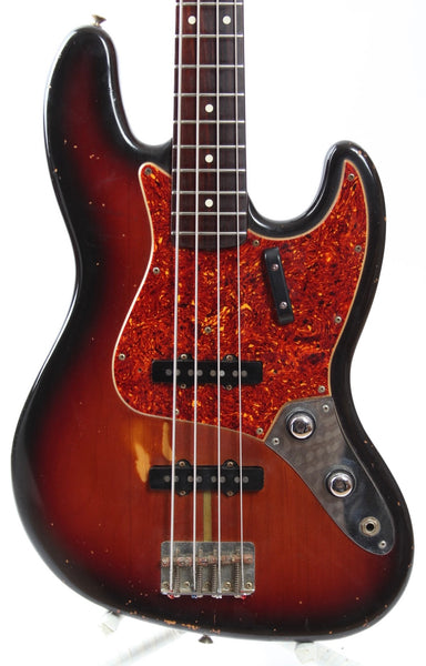 1989 Fender Jazz Bass American Vintage '62 Reissue, sunburst. Made in USA, serial number V049531. This bass is all original, except for the Schaller Drop Tuner, finger rest and one bridge saddle height screw. The finish shows a lot of wear and has yellowed considerably. The bass has perfect frets and is freshly setup. It features its original stackknobs dated to '82 (!) and a September '89 neck stamp. Comes with a black tolex Fender hardshell with green interior. Weighs 4.35kg.