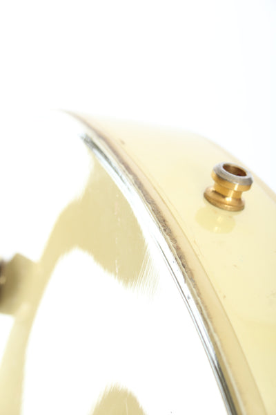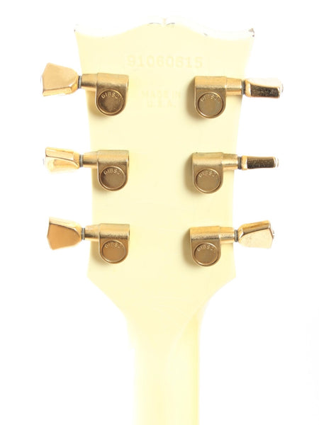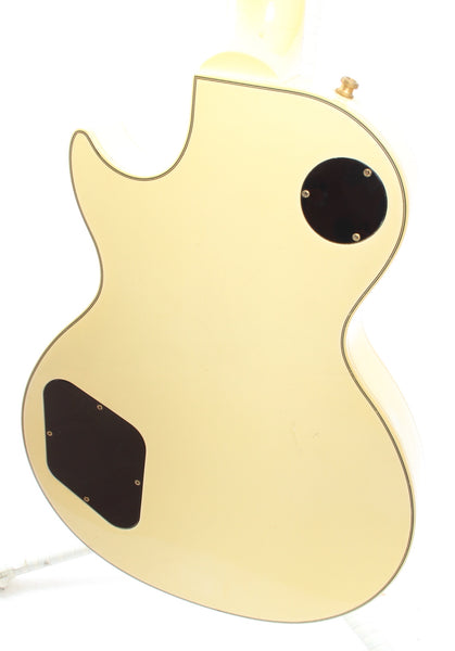 1990 Gibson Les Paul Custom, alpine white. Made in USA, serial number 91060615. This guitar is all original, except for the strap buttons, one black plastic pickup ring and the missing pickup covers. Features a factory mounted Patent Number stamped neck and HB-L bridge pickup, it's a very good sounding combo. The guitar shows a lot of wear, but it's hard to depict. Freshly serviced with 10-46 strings, excellent frets and playability. Comes with its original brown tolex Gibson hardshell case. Weighs 4.35kg.