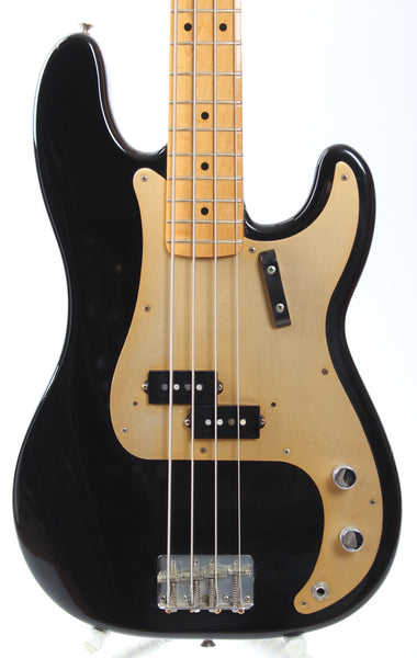 1992 Fender Precision Bass American Vintage '57 Reissue, black. Made in USA, serial number V060387. This bass is 100% original and comes with its original Fender tweed hardshell case, manual, tags and pickup and bridge covers. December 30th '91 neck date. Shows some wear and tear, three touched up dings on the body. Weighs 4.3kg.