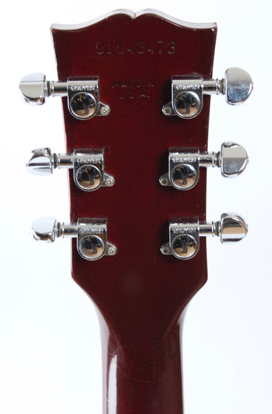 1993 Gibson Les Paul Junior, cherry red. Made in USA, serial number 91543473. This guitar is all original, except for the bridge and knobs. It has one extra strap button hole and shows some wear and tear. Freshly setup with 10-46 strings, excellent frets. Comes with its original brown tolex Gibson hardshell case. Weighs a 3.8kg.