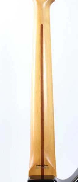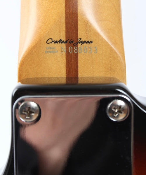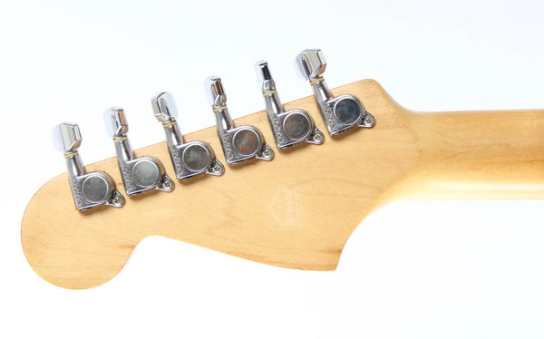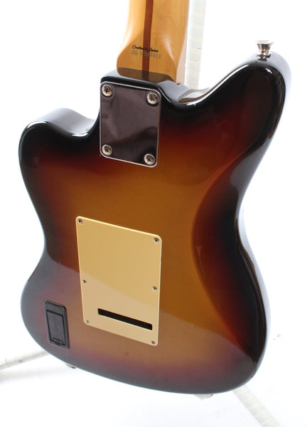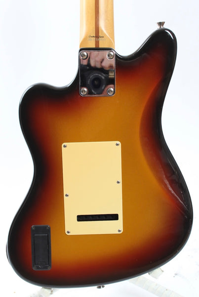 Ca. 1994 Fender Jazzmaster JM-Champ, sunburst. Made in Japan, serial number N088033. This features a full 24" scale and a built-in, battery powered amp with a clean and a distortion channel (!). Very nice condition, excellent frets, one noticeable and touched up ding on the body. Really fun guitar. Comes with a gigbag. Weighs 2.9kg.