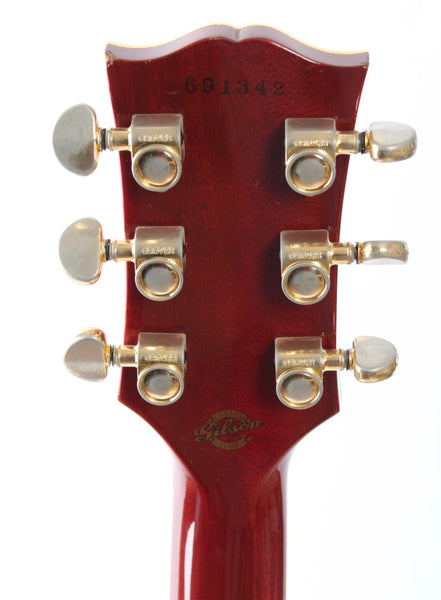 1996 Gibson Les Paul Custom, cherry burst. Made in USA, serial number 691342. This guitar is 100% original, except for the pickup covers. Ultra cool triple pickup Les Paul with a 2-piece mahogany top. It's in very clean condition other than a few dings. Excellent frets, freshly setup with 10-46 strings. The color is actually a very light burst only, depending on the lighting it just looks like a faded cherry red finish. Comes with its original black tolex Gibson hardshell case. Weighs 4.9kg.