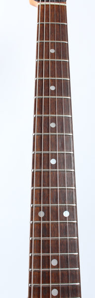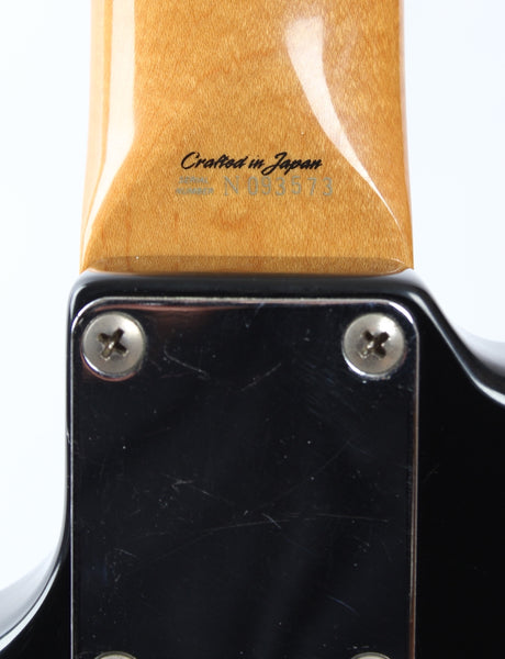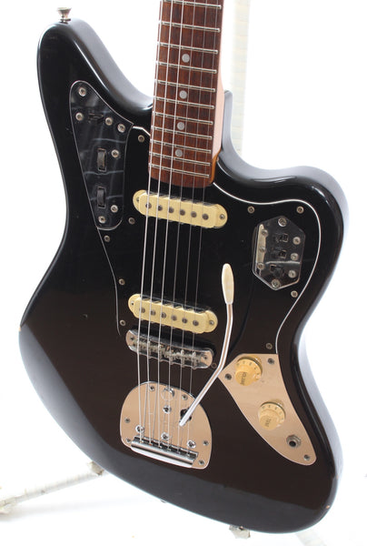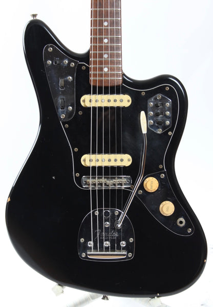 Ca. 1998 Fender Jaguar '66 Reissue, black. Crafted in Japan, serial number N093573. This guitar is all original except for the tremolo arm, pickguard and knobs. Very rare edition with matching headstock! Shows a lot of wear, but plays excellent thanks to a recent refret. Weighs 3.8kg.