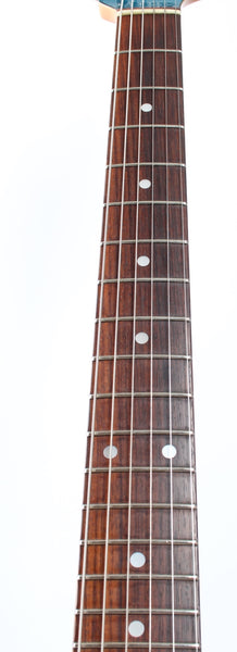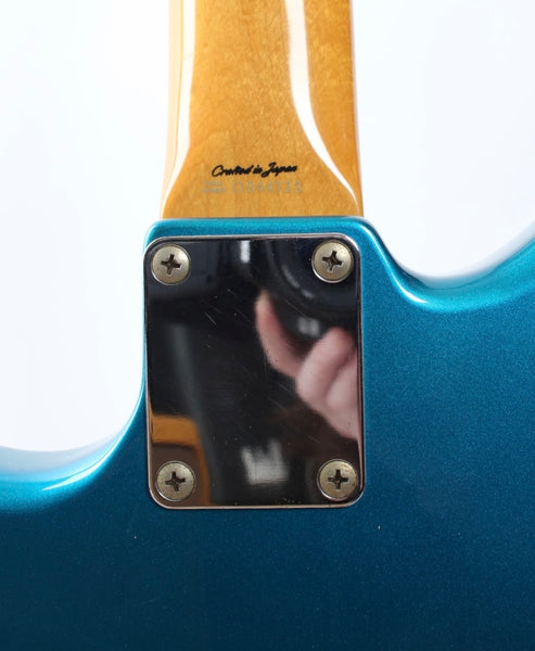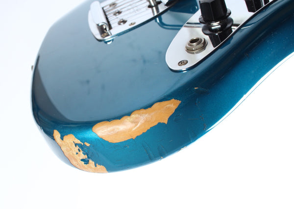 Ca. 1998 Fender Jaguar '66 Reissue, lake placid blue. Crafted in Japan, serial number O044723. This guitar is all original, except for one pot and the modified tremolo arm. Buzz stop installed. Rare custom order in lake placid blue and with a matching headstock. Some well visible dings on the body. Freshly serviced, excellent frets. Weighs 3.9kg.