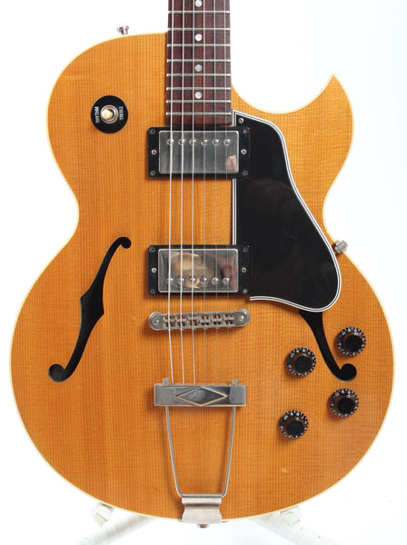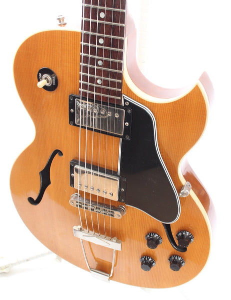 2001 Gibson Custom Shop ES-446S, natural. Made in USA, serial number CS11791. This guitar is all original, except for Gibson '57 Classic and '57+ pickups from 2023. Rare model with a solid spruce top with the bracing carved into the top (!!!). Shows some wear and tear, but has excellent frets and a very comfy neck. Comes with its original Gibson Custom Shop hardshell case. Weighs only 2.8kg.